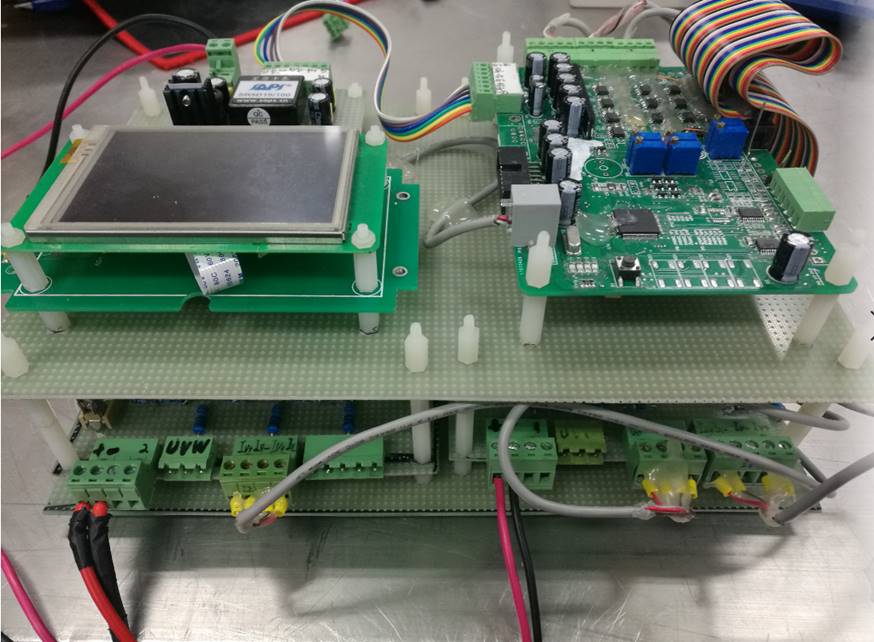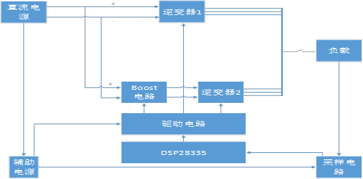 【基本情况】:本设计由两个直流电源及两个三相并网逆变器组成。其中,直流电源1与逆变器1实现模拟电网,稳定输出三相24V/50Hz的线电压。直流电源2与逆变器2模拟微网发电系统,通过调节系统输出电压幅值、相位、频率与逆变器1完成并网。为简化系统结构,本设计采用一个DSP(TMS320F28335)控制芯片产生6路PWM波,同时控制逆变器1和2。本系统采用电压外环和电流内环双环控制,电压外环主要控制三相逆变器的输出电压的稳定(24V);电流内环控制逆变器1和2的输出电流比例,通过调节逆变器2中Boost电路的PWM占空比,从而实现两组三相逆变器输出电流比例稳定可调。