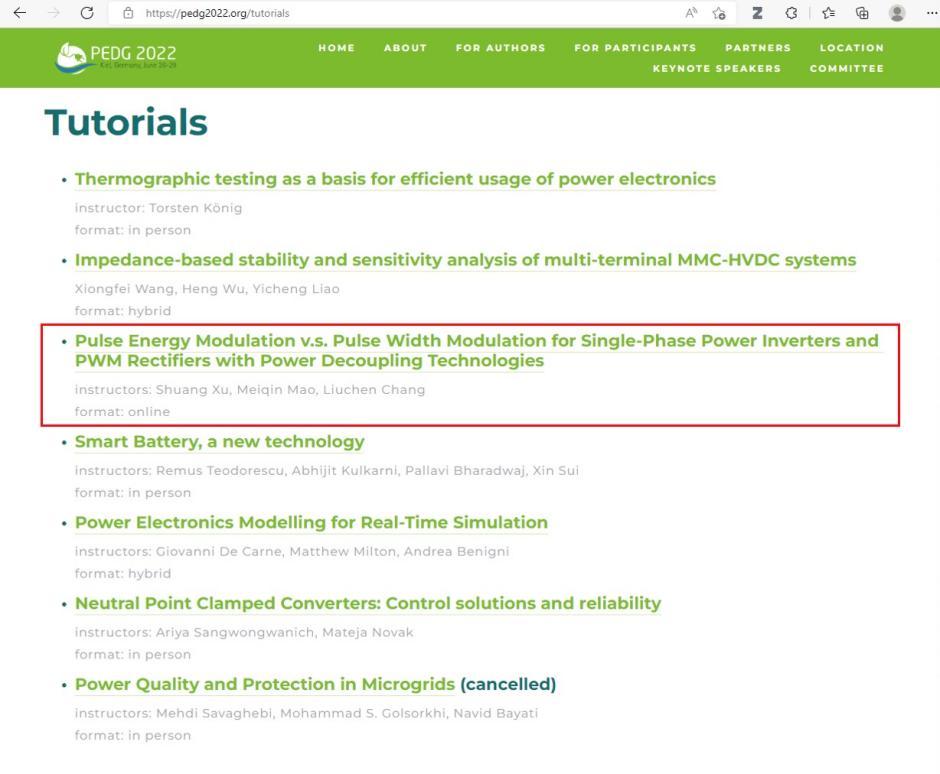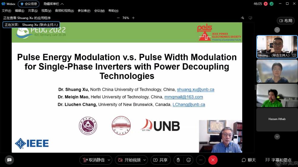 由IEEE电力电子学会主办的第十三届分布式发电系统电力电子国际会议(IEEEPEDG2022)于当地时间6月26日至6月29日在德国基尔召开,本次会议围绕“发展高效可靠的电力电子设备以致力于解决清洁能源发展”这一主题,为国内外专家学者分享领域内最新研究成果提供交流平台。公司betway88西汉姆联徐爽博士受邀以bw必威西汉姆联官网为第一单位,同加拿大皇家工程院院士张榴晨教授、合肥工业大学茆美琴教授一起,以“Pulse EnergyModulationv.s. Pulse Width Modulation for Single-Phase Inverters with Power Decoupling Technologies”为主题,做了时长为四个小时的线上特邀大会报告。