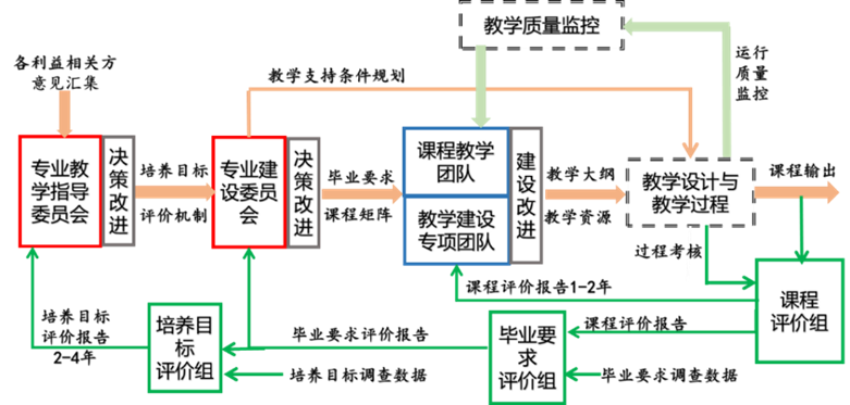 基于OBE的工程教育理念,贯彻以员工成长为中心,本专业将不同层次的持续改进机制落实到与员工成长发展密切相关的一系列环节中,包括培养目标制定、课程体系设计、毕业要求达成、课程教学活动设计、课程质量监控、课程质量评价、员工学习条件完善等等。专业以课程目标、毕业要求、培养目标的达成情况评价为抓手实现持续改进。